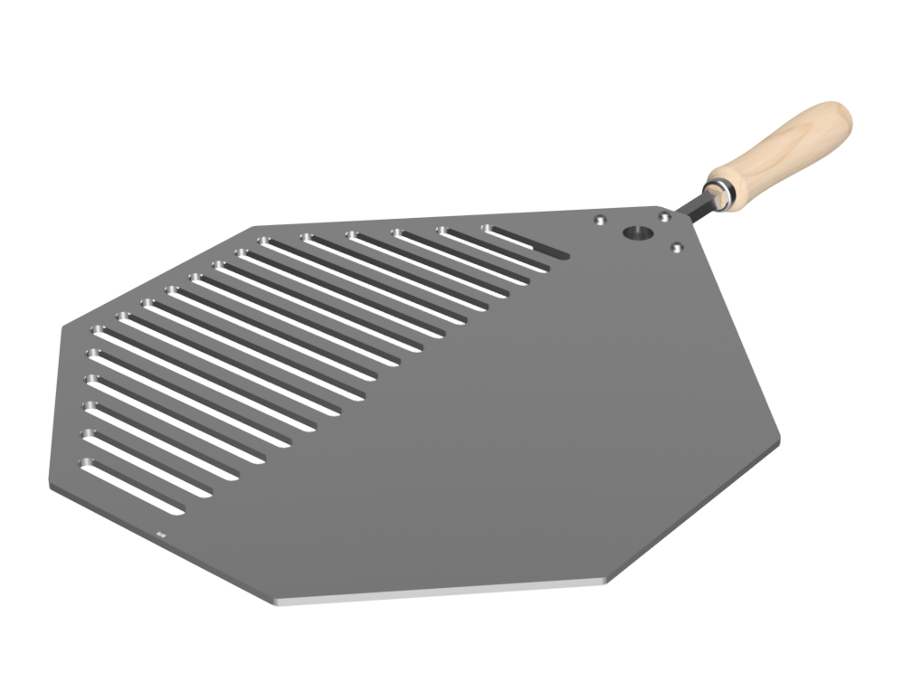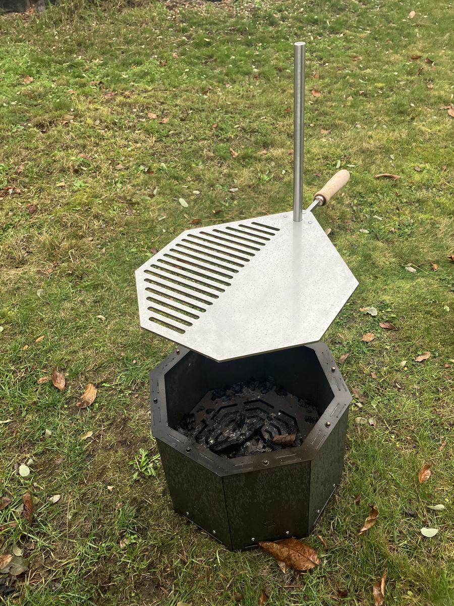 Kombinovaný gril z 5 mm silného nerezu má polovinu děrovanou pro příme rychlé pečení nad ohněm a polovinu plnou pro pozvolnější grilování.