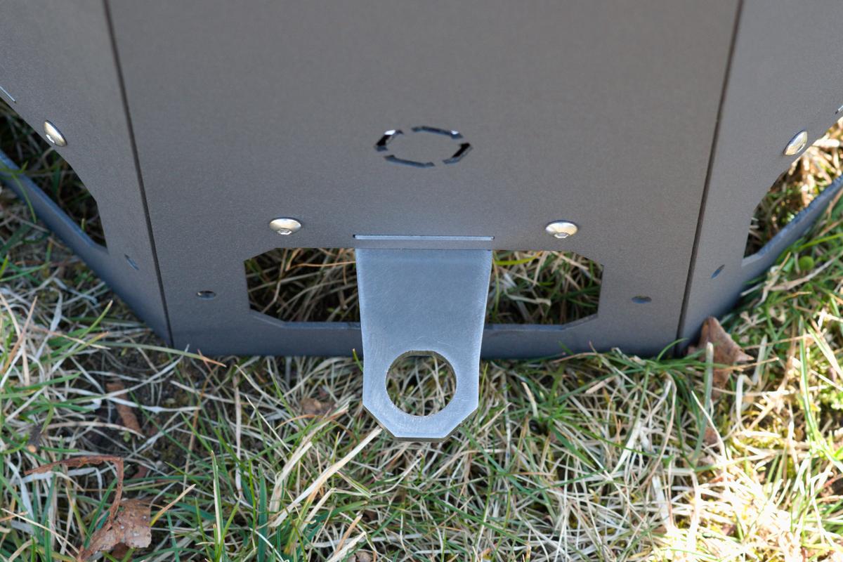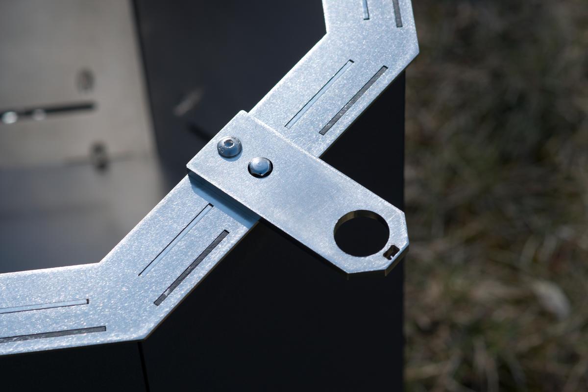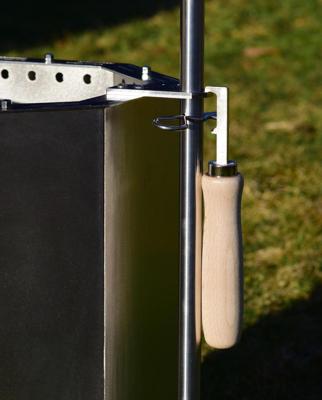 Na ohniště se namontují úchyty, do kterých se vsune nerezová tyč. Grilovací plát drží na tyči samosvorně, není třeba ho nijak zajišťovat.