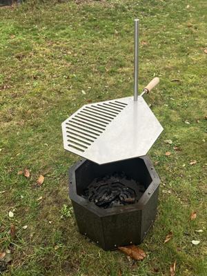 Na ohniště se namontují úchyty, do kterých se vsune nerezová tyč. Grilovací plát drží na tyči samosvorně, není třeba ho nijak zajišťovat.